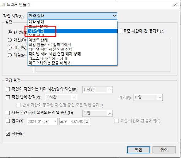 새 작업을 만드는 과정에서 트리거를 설정할 수 있는데요. 트리거란 일정한 반응, 작용이라 생각하면 됩니다. 예를 들어, 일정 시간이 되었을 때, 특정 프로그램에 대한 조작을 진행하는 경우 예약 설정을 통해 지정하게 됩니다. 여기서 시간이 트리거가 되는 것이죠. 우리는 윈도우가 시작되었을 때를 트리거로 잡아주면 됩니다.